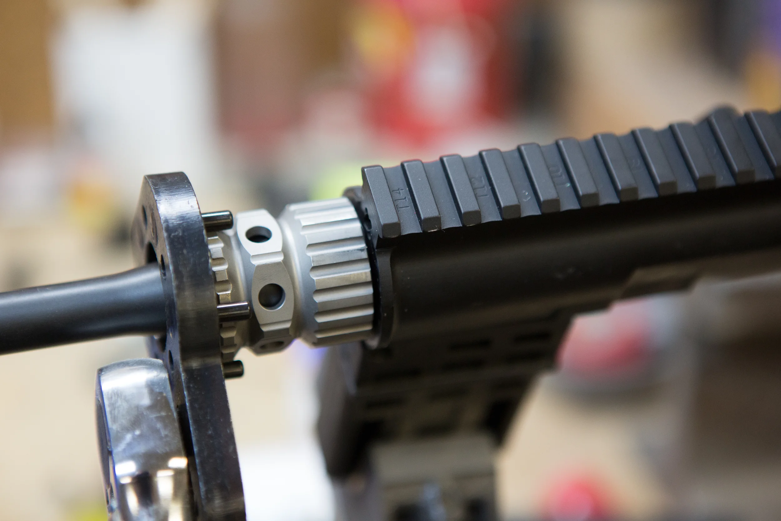 We use titanium barrel nuts to ensure the maximum strength with minimum weight and minimum thermal expansion. For all rifles we follow the same principle. Threads are treated with heat resistant grease and the nut is threaded on and tightened to 30ft.lbs several times to remove burrs and other friction points that could have happened during manufacturing. The nut is then tightened as per Colt factory specs to between 30-80 ft.lbs, ensuring alignment of the nut to allow the gas tube to pass through the nut.