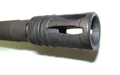 Finally the flash hider is fixed in place, with 14.5" barrels a longer flash hider is used to reach the minimum legal length of 16", and it is pinned and welded into place.